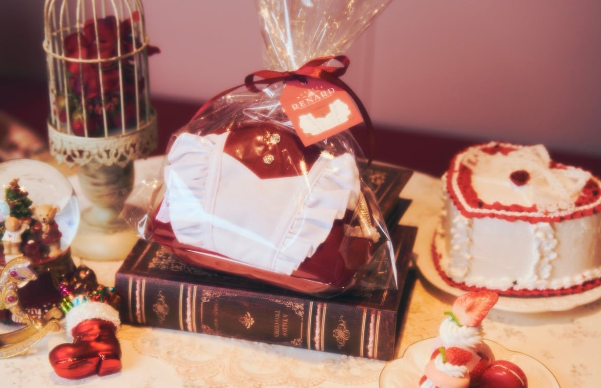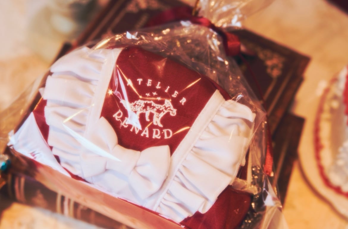 エプロンのフリル、キツネ型チャーム、そしてロゴの刺繍がきらめく、atelier renardのメイド服をモチーフにしたポーチ⟡.·